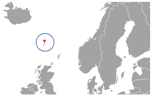 <아이슬란드, 페로 제도, 영국의 위치. 빨간 원 안이 페로 제도. 왼쪽 위가 아이슬란드 왼쪽 아래가 영국(스코틀랜드) 이다>