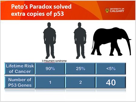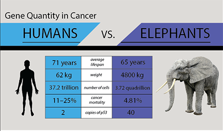 코끼리는 자연적으로 인간보다 20배나 많은 TP53 유전자를 소유하고 있다는 사실을 통해서도