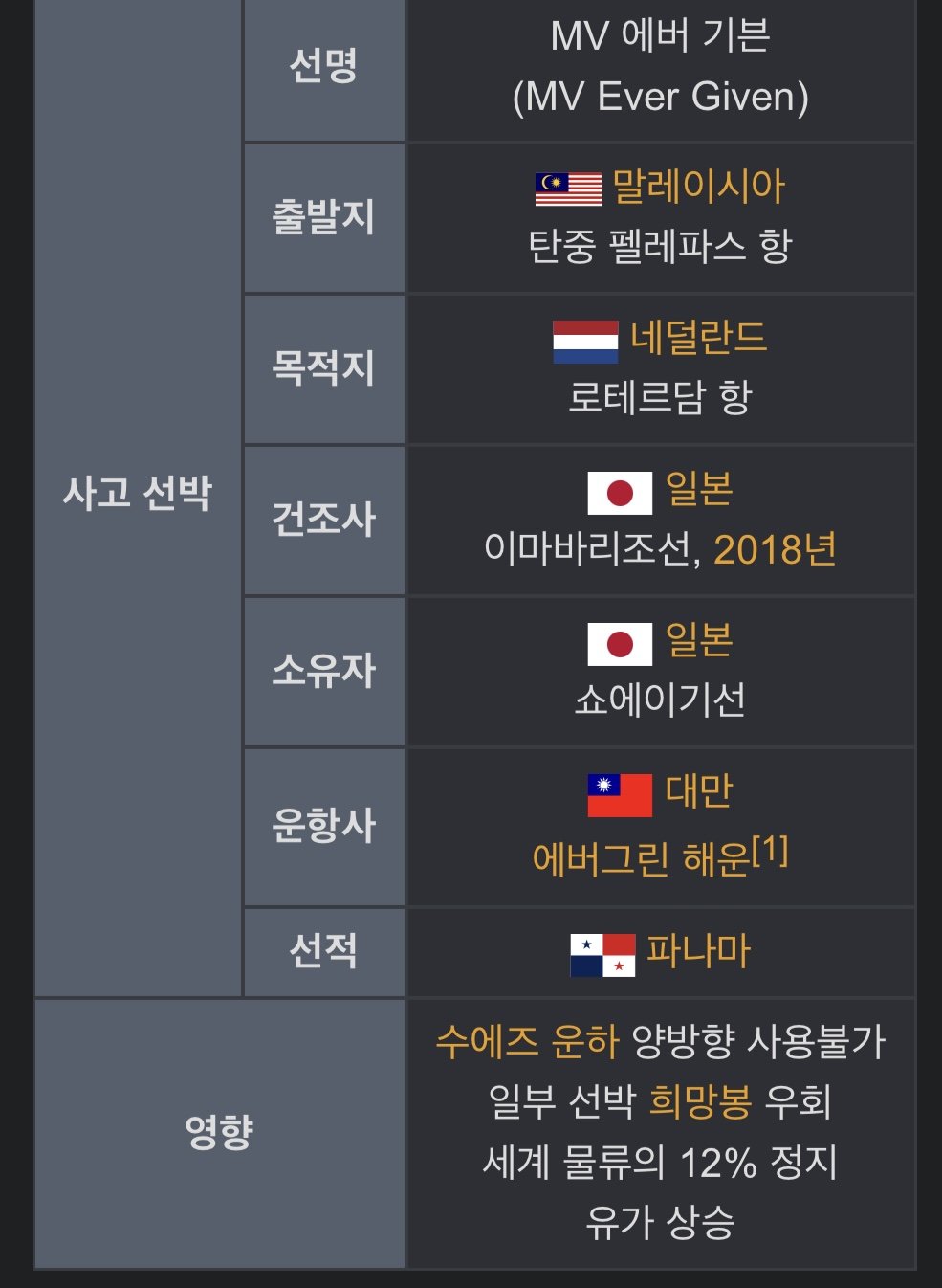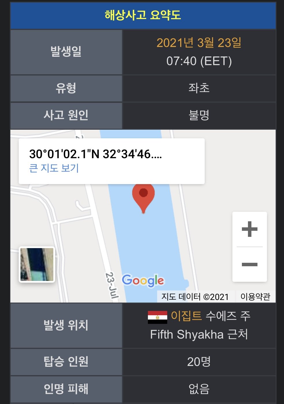2021년 3월 23일 동유럽 표준시로 오전 7시 40분 경, 파나마 선적 초대형 컨테이너선 에버 기븐(EVER GIVEN)호가 수에즈 운하 내에서 좌초되어 운하가 양방향 통제된 사고다.
