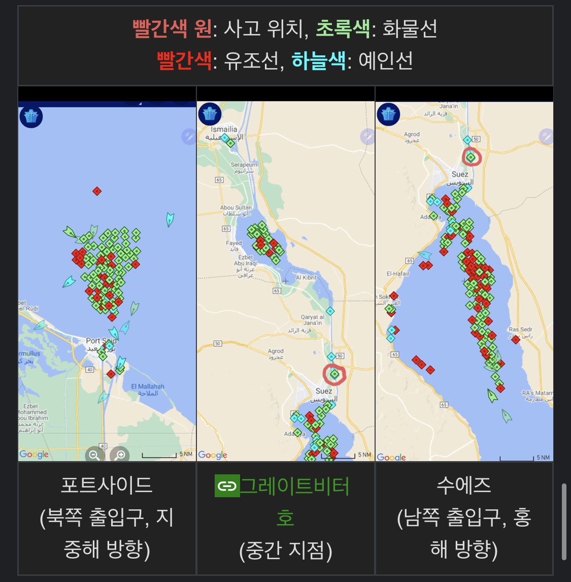 중형선도 아닌 초대형선인 에버 기븐호가 운하 출입구도 아닌, 수로 중간을 가로로 떡하니 막아버리는 바람에 운하가 양방향 통제되면서 지중해(북쪽 출입구), 홍해(남쪽 출입구) 양쪽에서는 발이 묶인 선박 200척 이상이 닻을 내리고 대기 중이다.