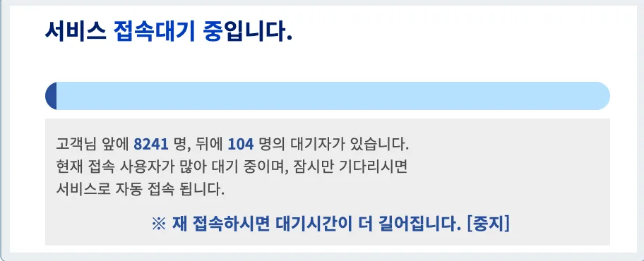 '서비스 접속대기 중입니다', '앞에 몇 명', '뒤에 몇 명'(선택), '재접속하면 대기시간이 더 길어집니다.'