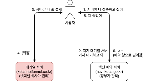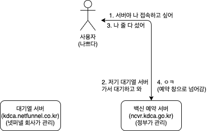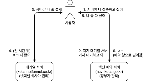 - 백신 예약 서버는 사용자에게 '대기열 서버에 가서 줄 서고 올 것'을 지시한다.