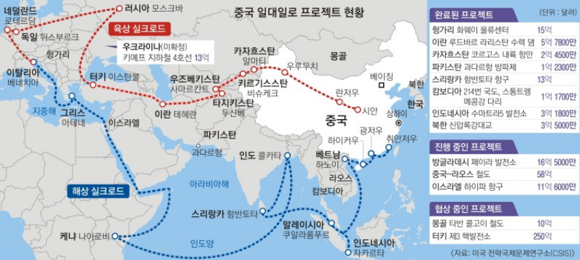 24. 49개국을 도로, 철도, 천연 가스관, 광케이블 등으로 연결하고, 해상으로도 연결된 항구를 개발하겠다는 내용이니, 엄청난 규모의 개발이 따라붙게 됨.